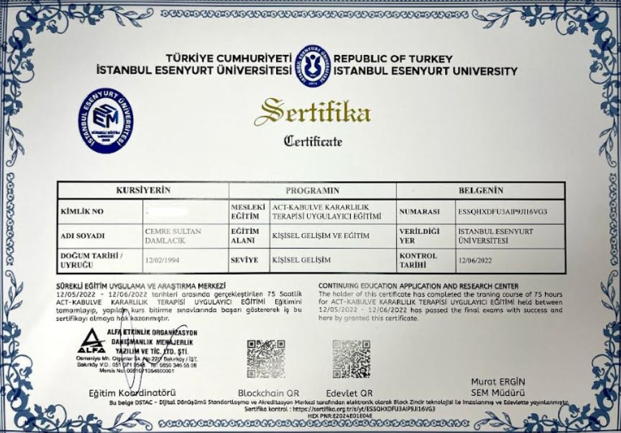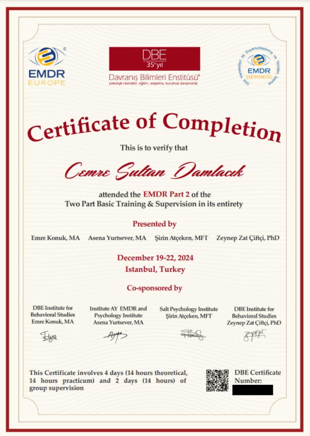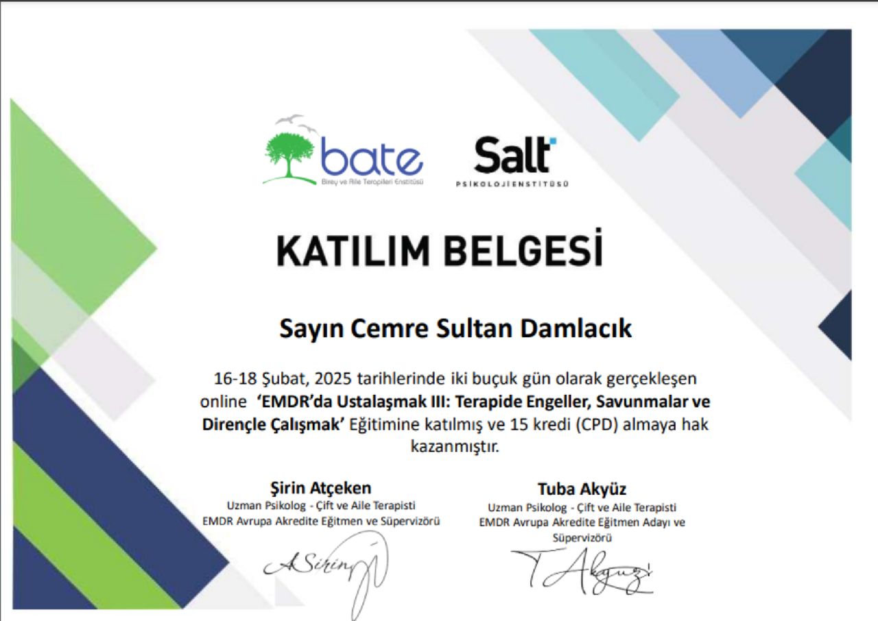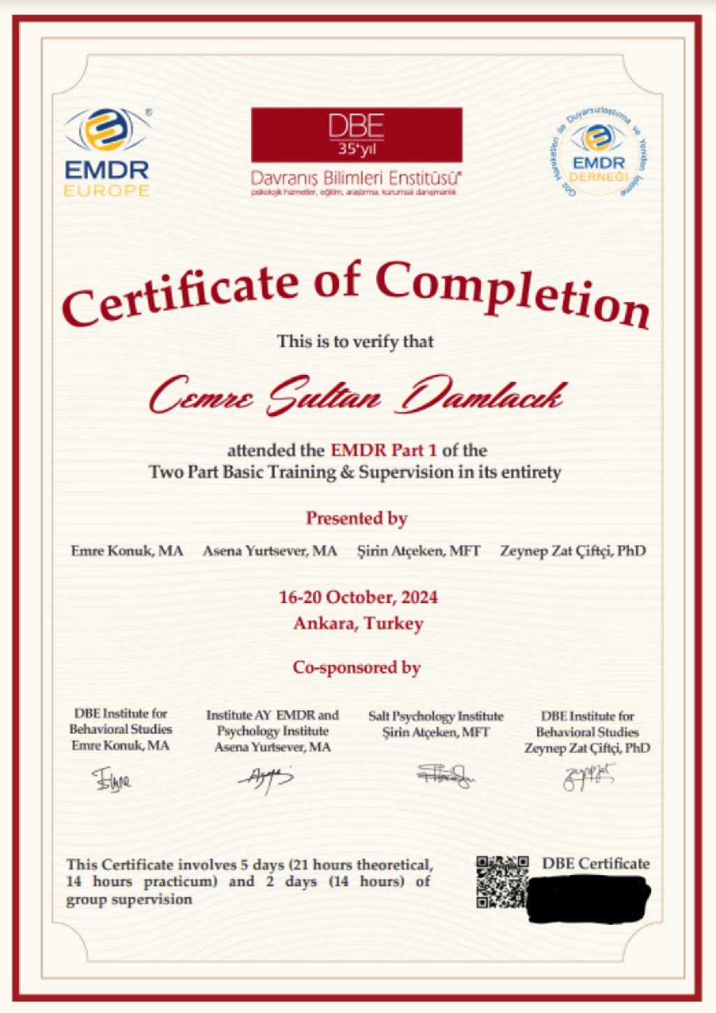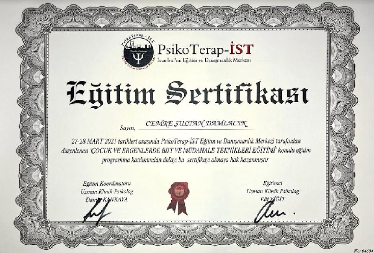 Psikolog Cemre Sultan Damlacık, yüz yüze görüşmelerini Ankara/ Çukurambar’da sürdürmekte; bunun yanı sıra yurt içi ve yurt dışından başvuran bireylere online psikolojik destek hizmeti sunmaktadır.
