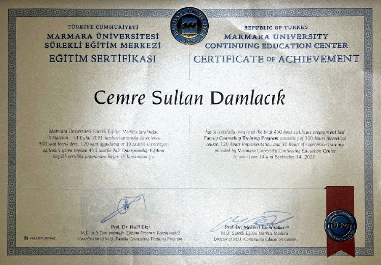 Aynı zamanda Marmara Üniversitesi yüksek lisans düzeyinde Aile Danışmanlığı eğitimini tamamlayarak aile ve çift çalışmaları alanında yetkinlik kazanmıştır.
